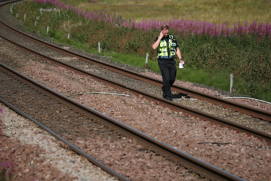 A police officer walks along the tracks at Carmont crossing, south of the scene in Stonehaven, Aberdeenshire, where a ScotRail train derailed at about 9.40am in the morning, August 12, 2020