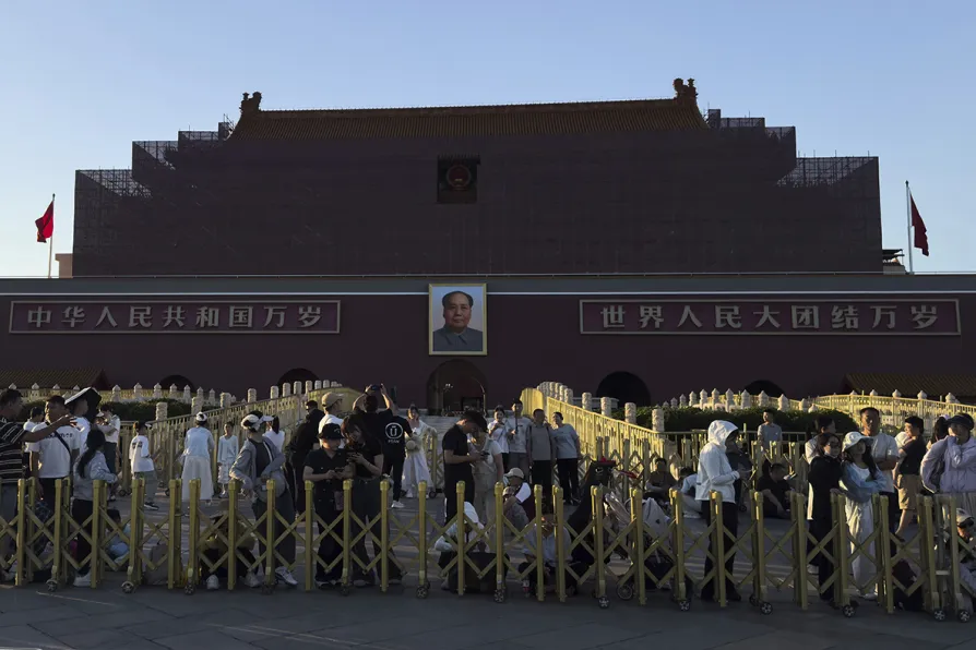 Visitors gather in front of Tiananmen Gate covered with frames and scaffolding for renovations as they wait for the flag lowering ceremony on the eve of the June 4 anniversary, in Beijing, Tuesday, June 3, 2025