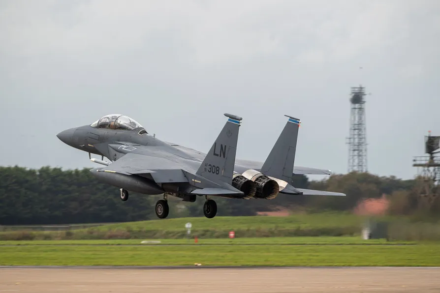 An F-15E Strike Eagle of the United States Air Force's (USAF) 48th Fighter Wing, stationed at RAF Lakenheath in Suffolk, lands at RAF Coningsby in Linolnshire, September 30, 2020