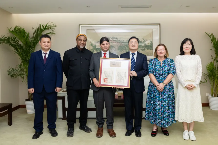 The Morning Star hands over the historic letter to Xinhua Daily. L-R: Yang Zhihui, Roger McKenzie, Ben Chacko, Chen Renyun, Bernadette Keaveney, Shen Zhengrong