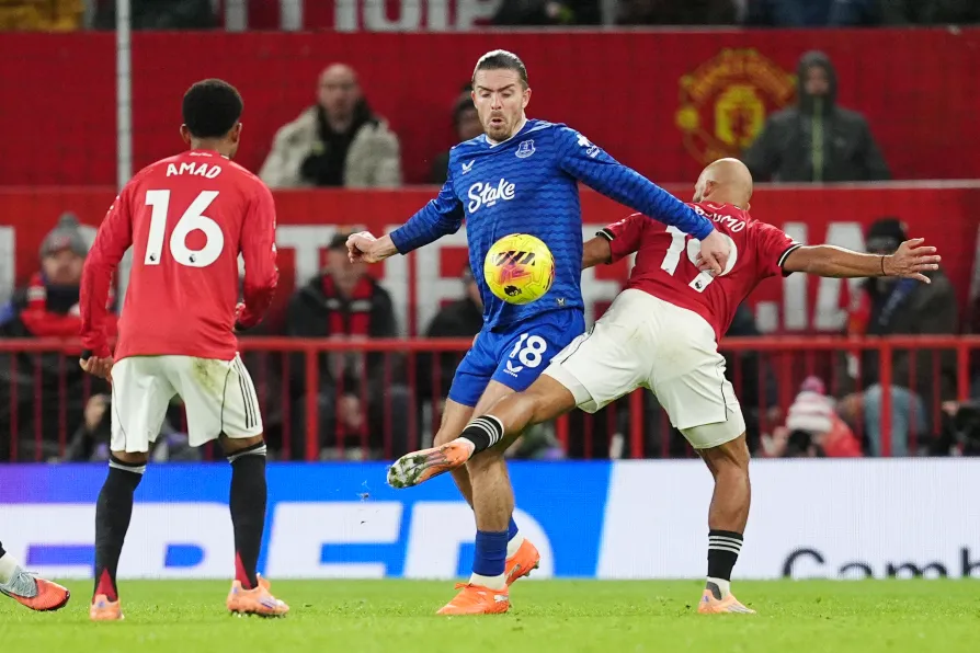 Everton's Jack Grealish and Manchester United's Bryan Mbeumo (right) battle for the ball during the Premier League match at Old Trafford, Manchester, November 24, 2025