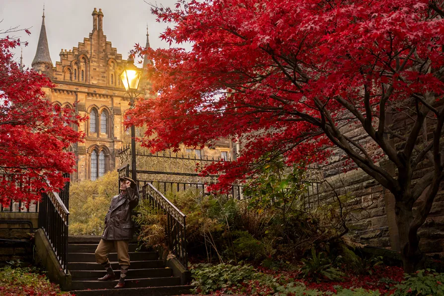 A student looks at trees with autumnal colour at the University of Glasgow campus, November 7, 2025