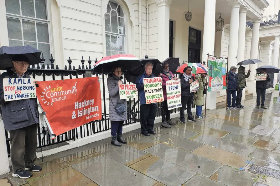 On October 17, Caribbean Labour Solidarity (CLS), with others, picketed the Grenada High Commission, calling on the government of Dickon Amiss Thomas Mitchell to resist US bullying. We also picketed the Trinidad & Tobago High Commission in London on October 29 to shame the government of PM Kamla Persad-Bissessar, who is the cheerleader for the US’s war on Venezuela, despite two Trinidadian fishermen having arbitrarily been murdered on the high seas by the US, in an attack claimed to be on “narco-traffickers.” To date, more than 52 have been killed in what could justifiably be seen as war crimes, with no evidence of wrongdoing being provided.
