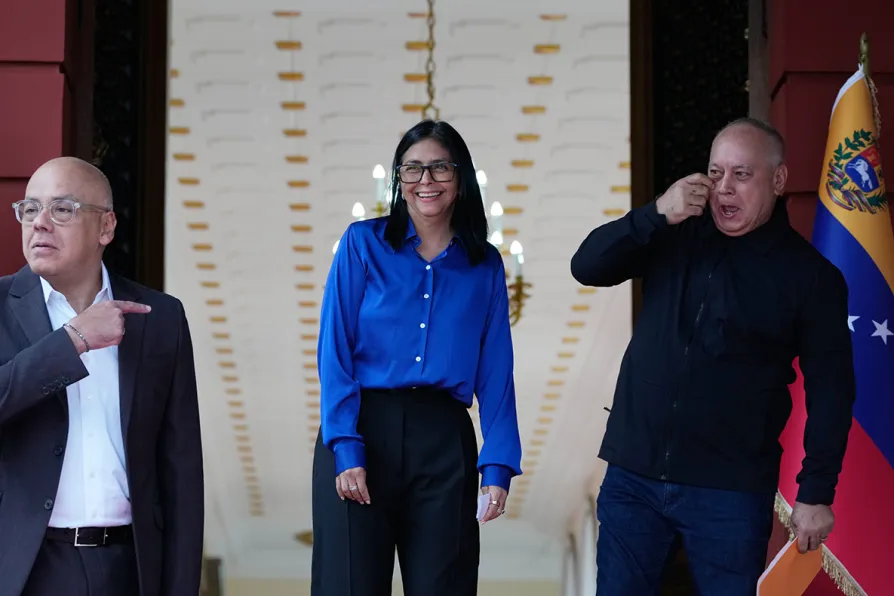 Venezuela's acting President Delcy Rodriguez (centre) with Interior Minister Diosdado Cabello (right) and National Assembly President Jorge Rodriguez after a press briefing at Miraflores presidential palace in Caracas, Venezuela, January 14, 2026