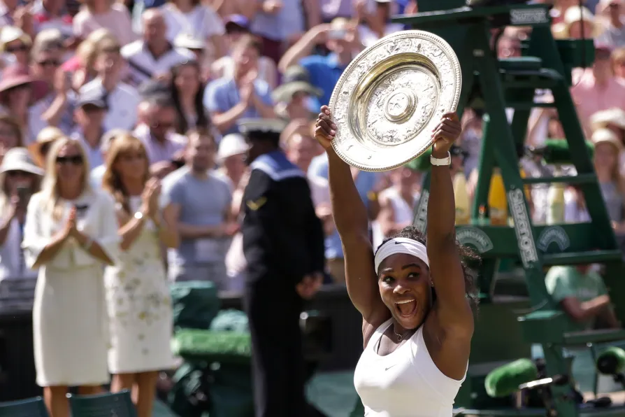Serena Williams, of the United States, reacts as she holds up the trophy after winning the women's singles final against Garbine Muguruza of Spain, at the All England Lawn Tennis Championships in Wimbledon, London, July 11, 2015