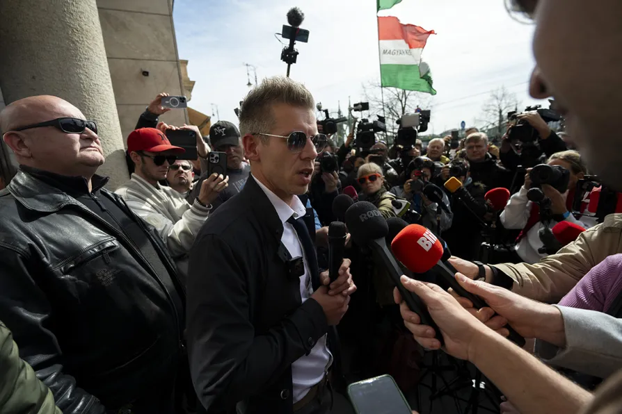 Former Hungarian government insider Peter Magyar addresses journalists outside the Public Prosecutor's office in Budapest, Hungary, March 26, 2024